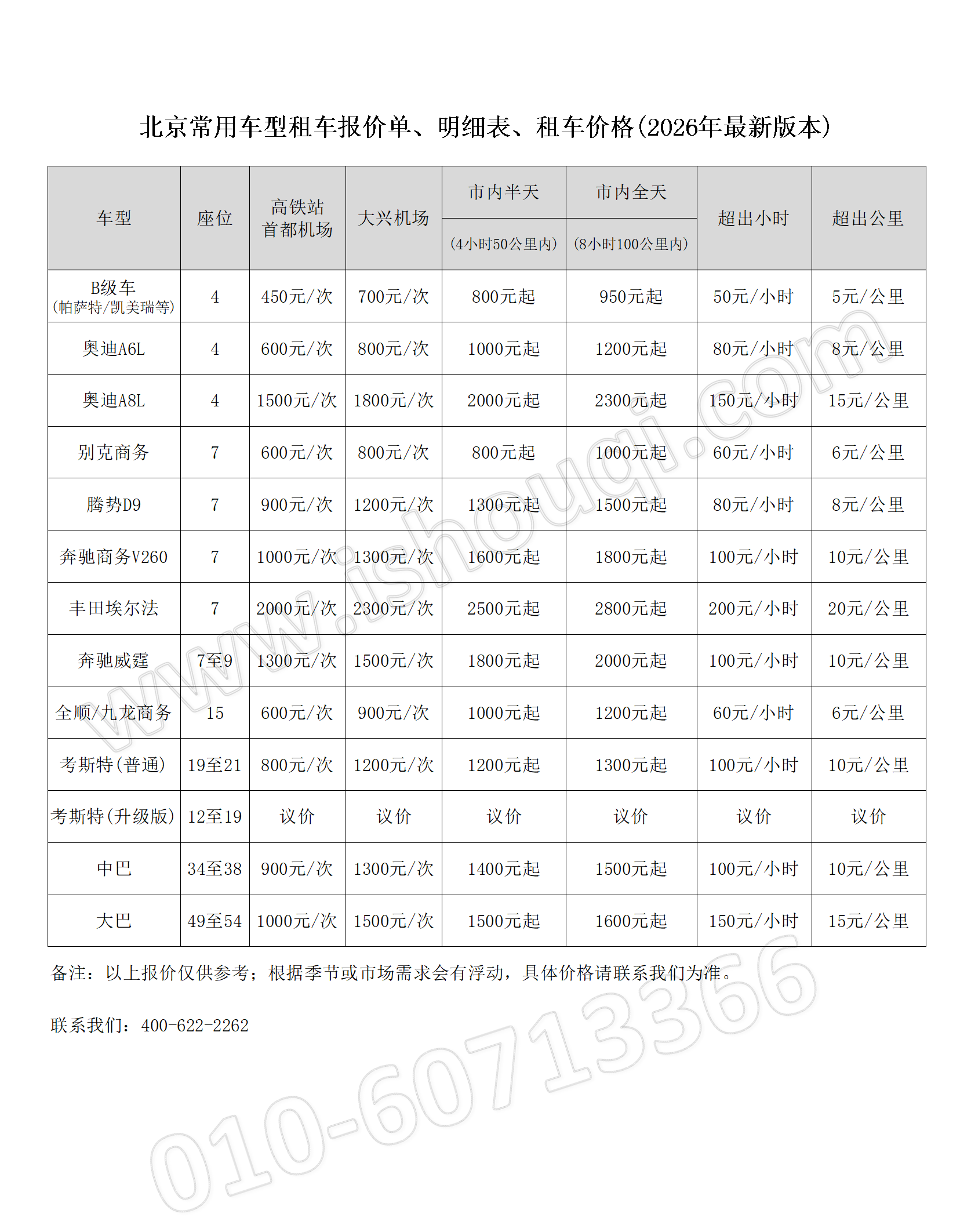 3.超出部分均按照雙超標(biāo)準(zhǔn)收取,北京周邊旅游包車、大型會議租車,需根據(jù)實(shí)際用車情況來制定方案;